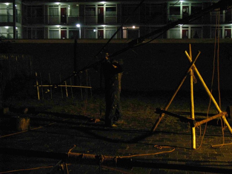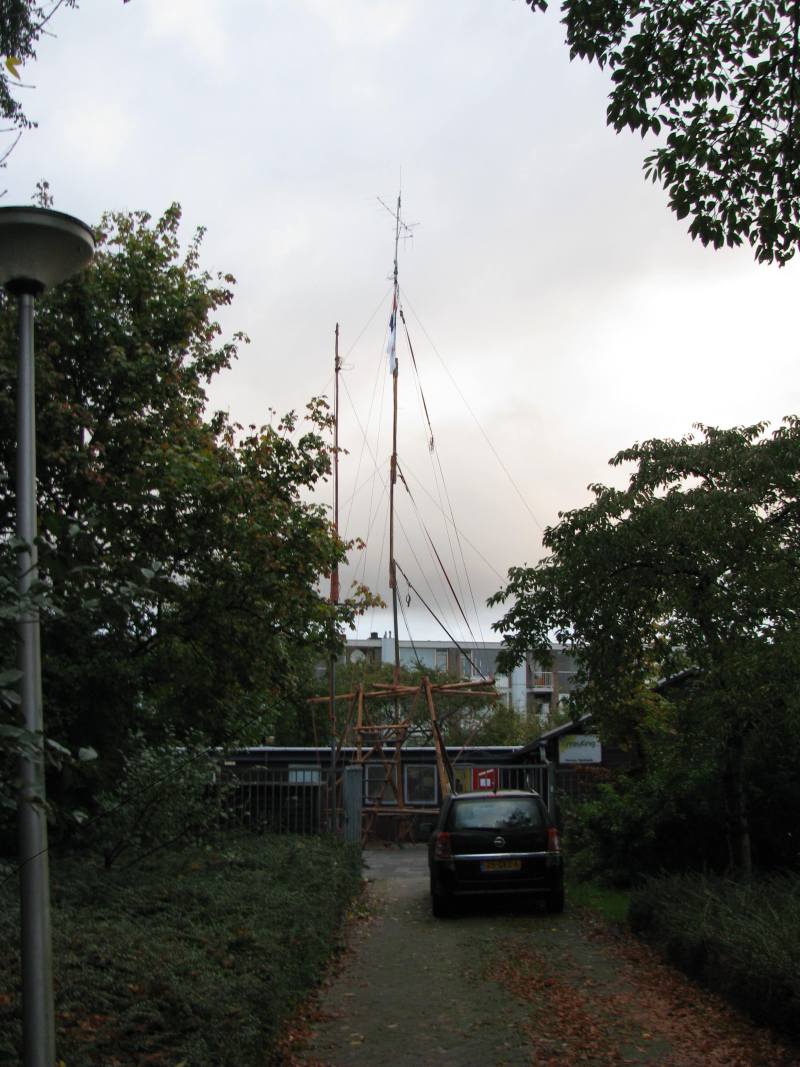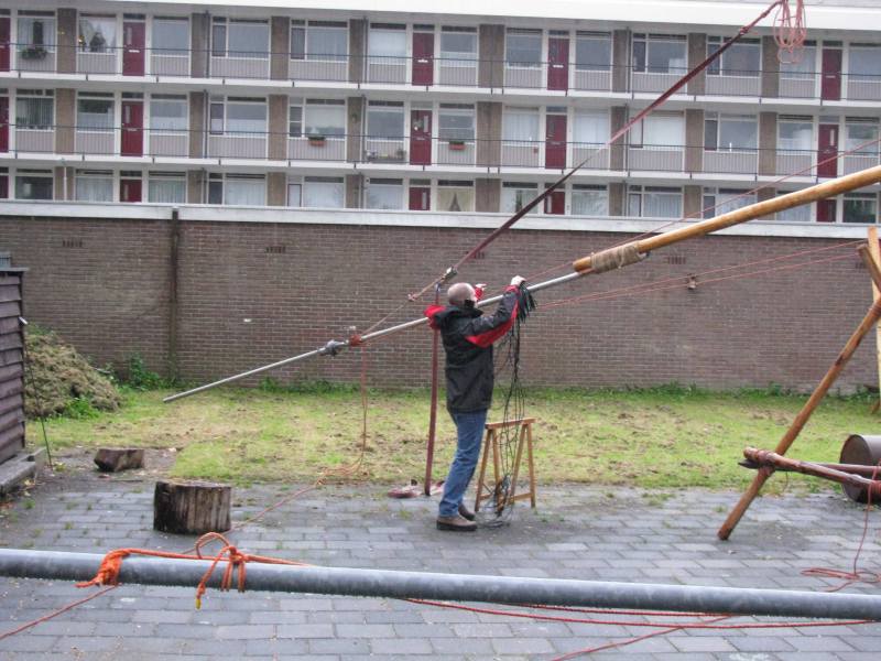 | In de stromende regen worden de antennes in de mast gehangen. Gelukkig waren de beugels voor de antennes dit jaar al klaar en konden de antennes snel in de mast worden gehangen. | De