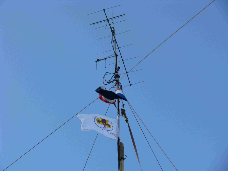 | De 2 meter rondstraler, 8 elements Yagi voor 2 meter, HB9CV antenne en de 70 cm rondstraler in de mast. | Logo van de scoutinggroep Florence Nightingale in