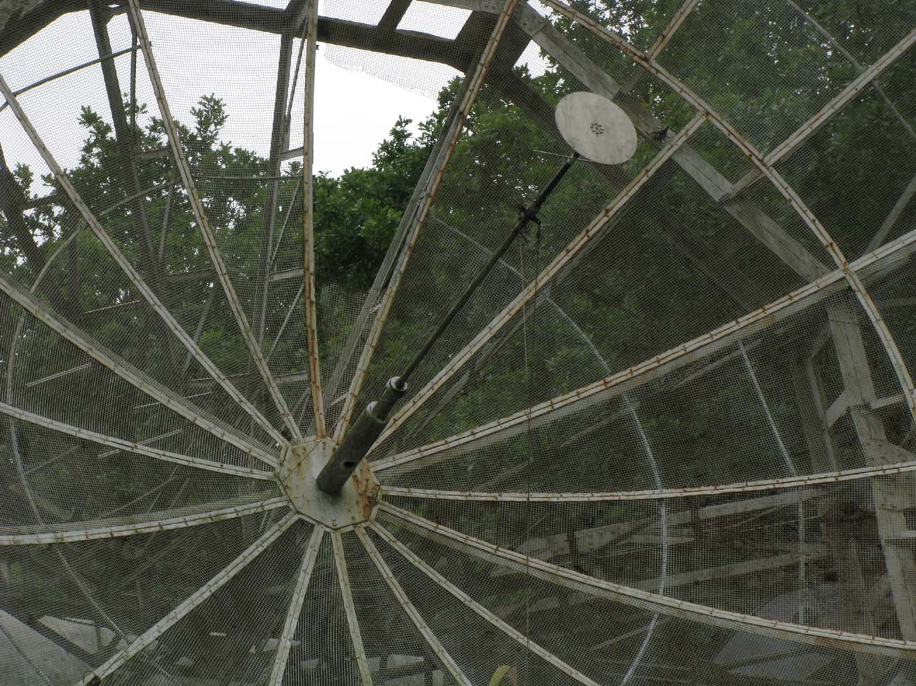 | De Wurzburg-Riesen antenne opgesteld bij het Planetron in Dwingeloo. Te zien is de bedieningsruimte achter de schotel, de antenne met het brandpunt en het mechaniek van de antenne. | ![]() |